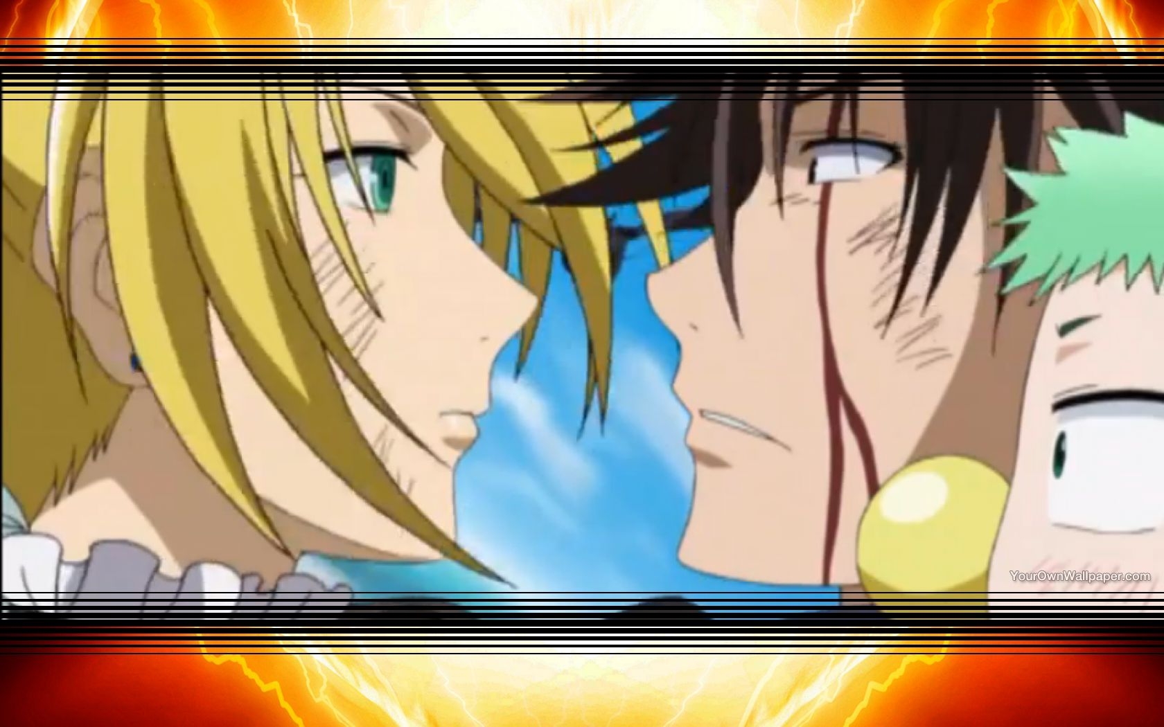 Description: Two anime characters are kissing in front of a fire background with a lightning effect behind them and a red background with a black border.