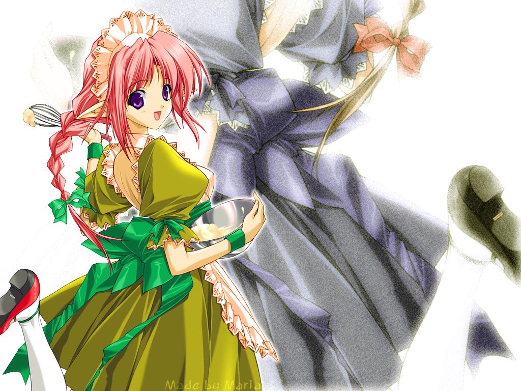 Description: Two anime characters dressed in dresses and holding a plate of food and a bird on a perch above them.