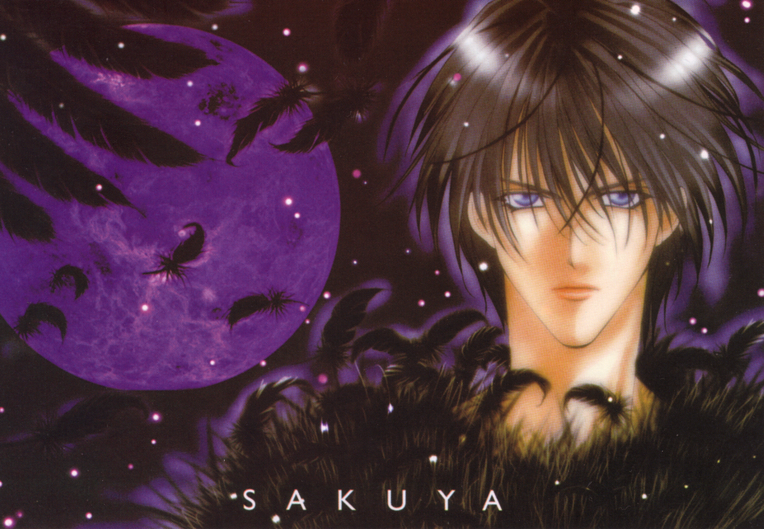 Description: A anime character with a purple background and a full moon in the background with bats flying around him and a purple moon in the background.