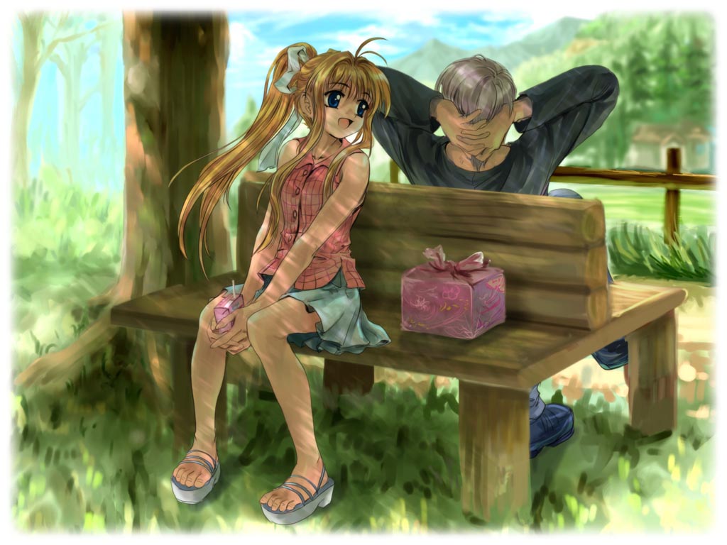 Description: A man and a woman sitting on a bench next to each other with a box of presents on it.
