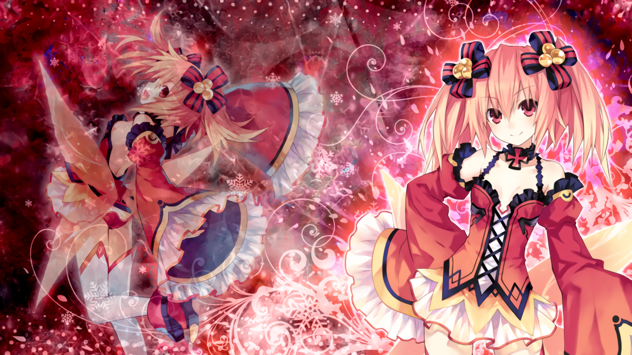 Description: A anime character with a pink outfit and a red dress and a pink background with stars and swirls.