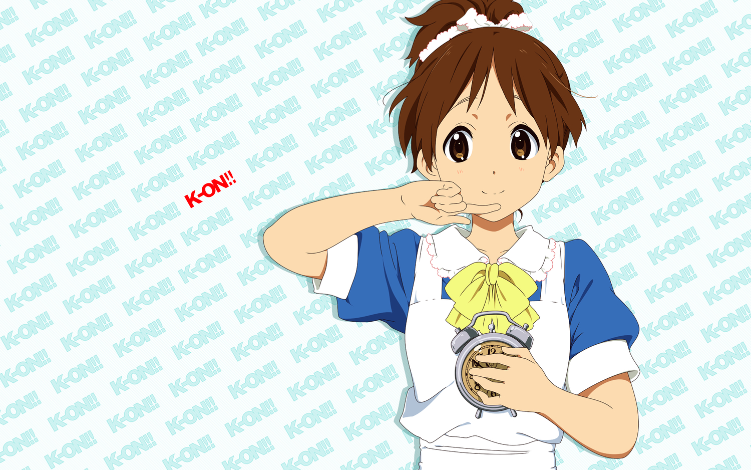 Description: A anime character with a ponytail holding a clock and pointing to her right side with a finger on her mouth.