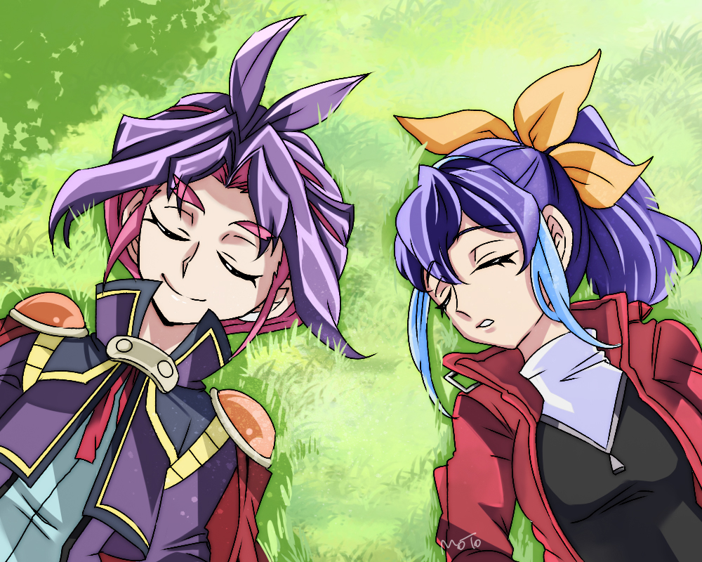 Description: Two anime characters with purple hair and blue eyes.