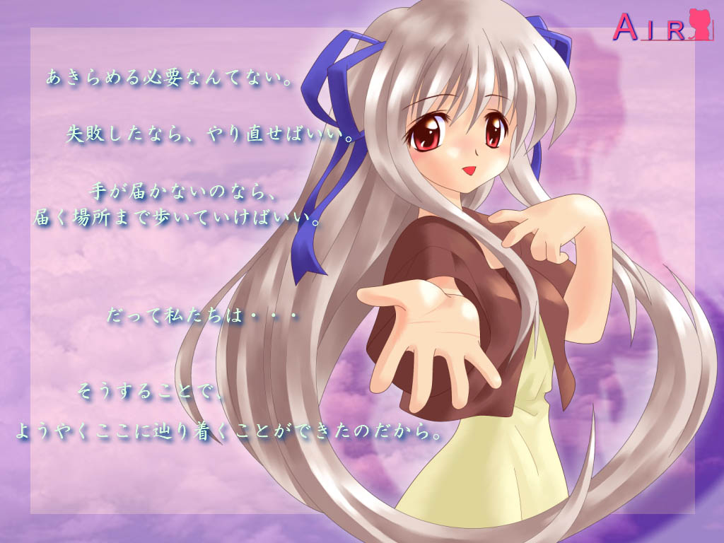 Description: A anime character with long white hair and a purple background with words written in japanese characters below her arm.
