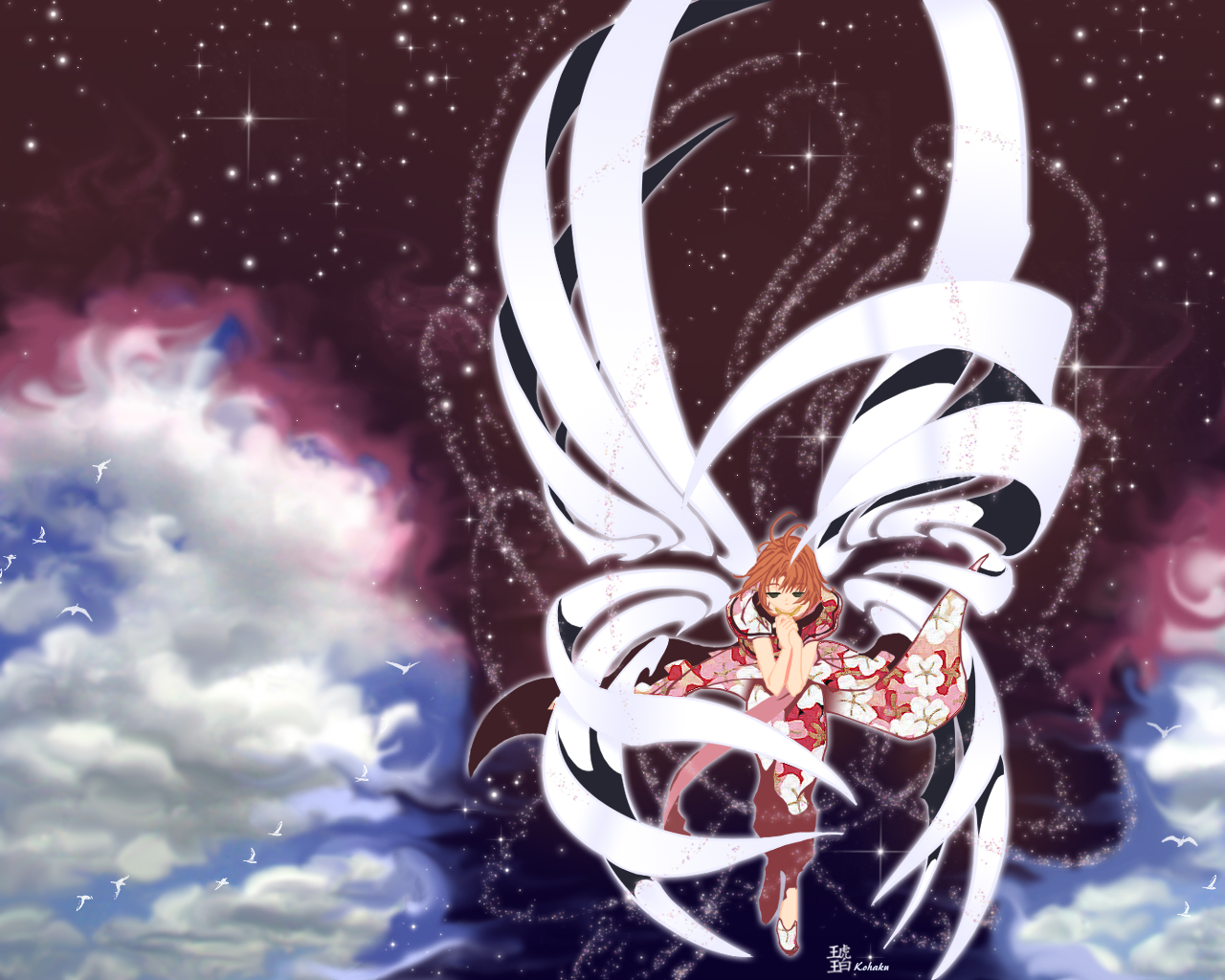Description: A anime character with a white hair and a red head is flying through the air with a white ribbon around her neck.
