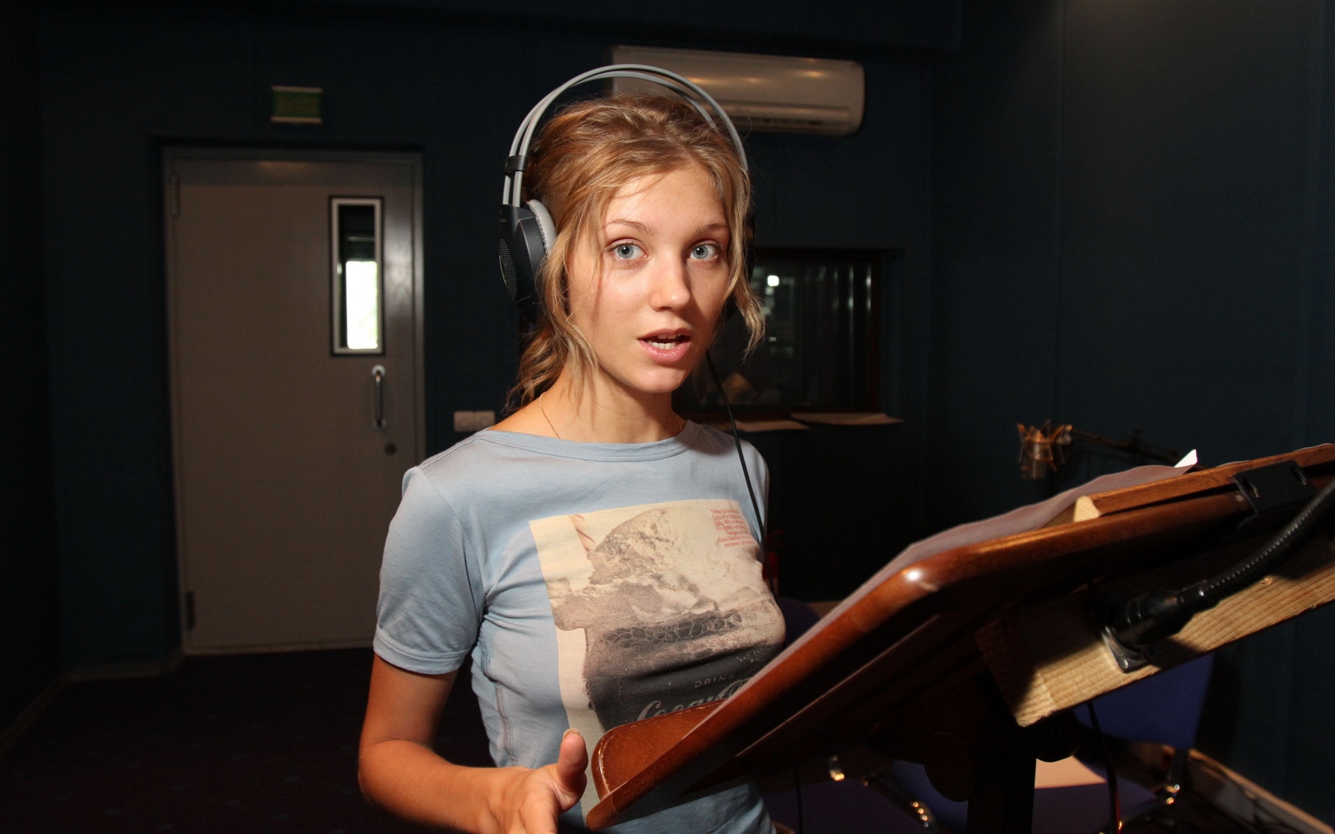 Description: A woman wearing headphones holding a wooden instrument in a room with a door and a doorway in the background.