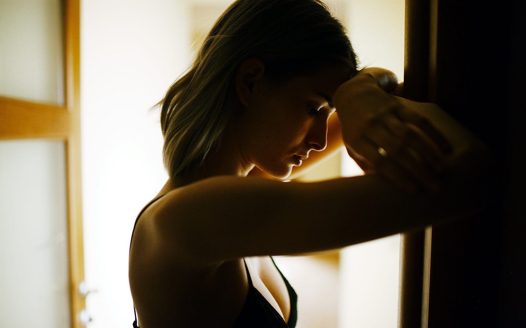 Description: A woman in a black top is holding her hand on her head and looking down at her hair and looking down.