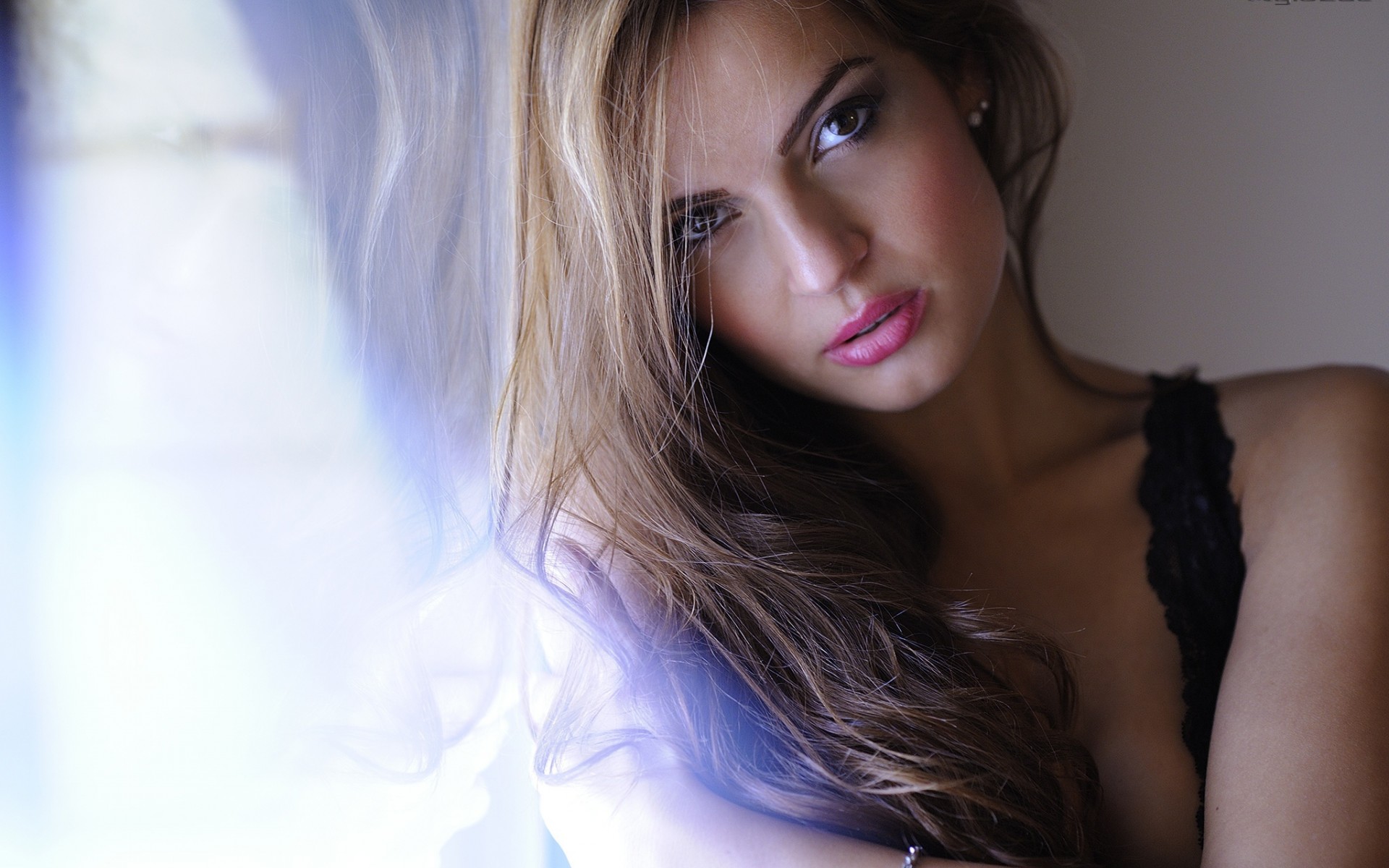 Description: A woman with long hair is posing for a picture with her hand on her shoulder and her eyes closed.
