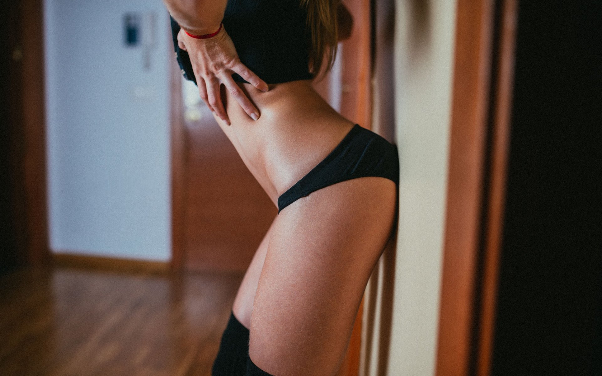 Description: A woman in a black top is standing in a room with her butt exposed and her hand on her hip.