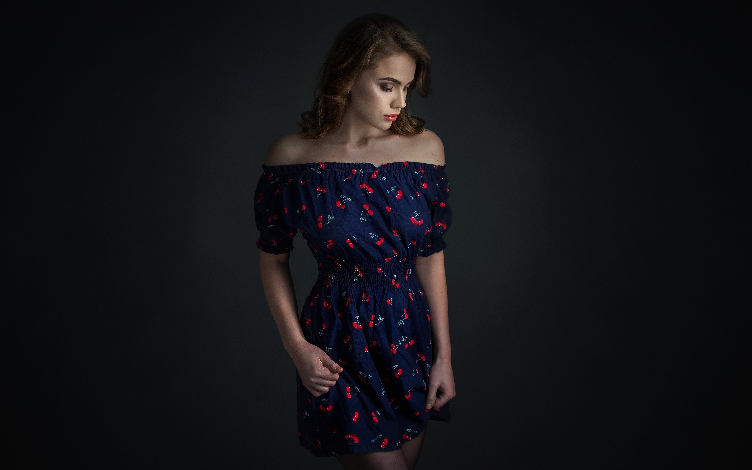 Description: A woman in a dress posing for a picture in a dark room with a black background and a black background.