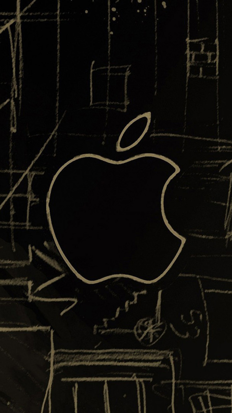 Description: A drawing of an apple on a black background with a white outline of a building and a black apple.