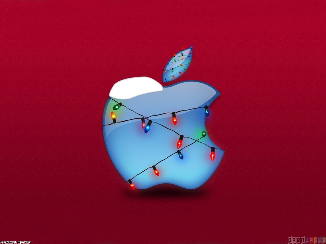 Description: An apple with a string of lights on it's side and a butterfly flying over it's head.