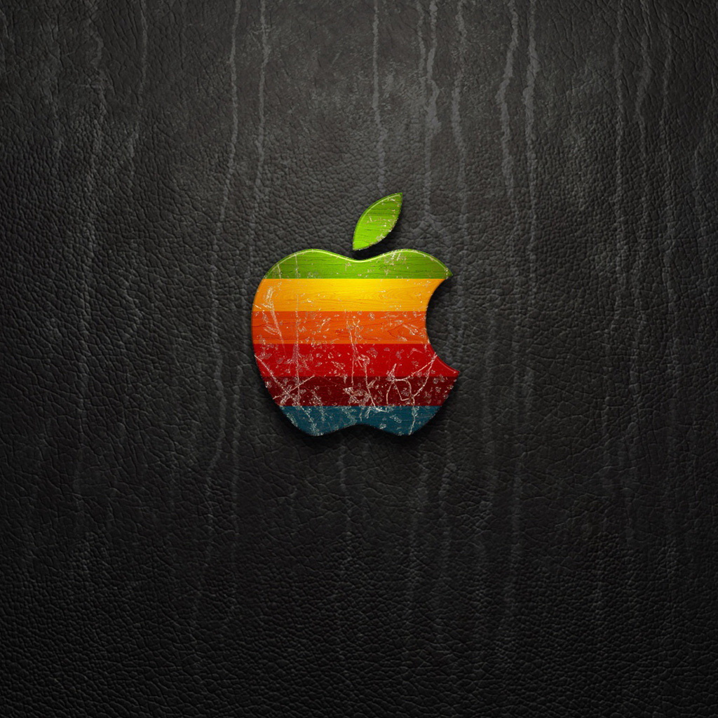 Description: A apple logo on a black leather background with a rainbow apple on it's side and a leaf on top.