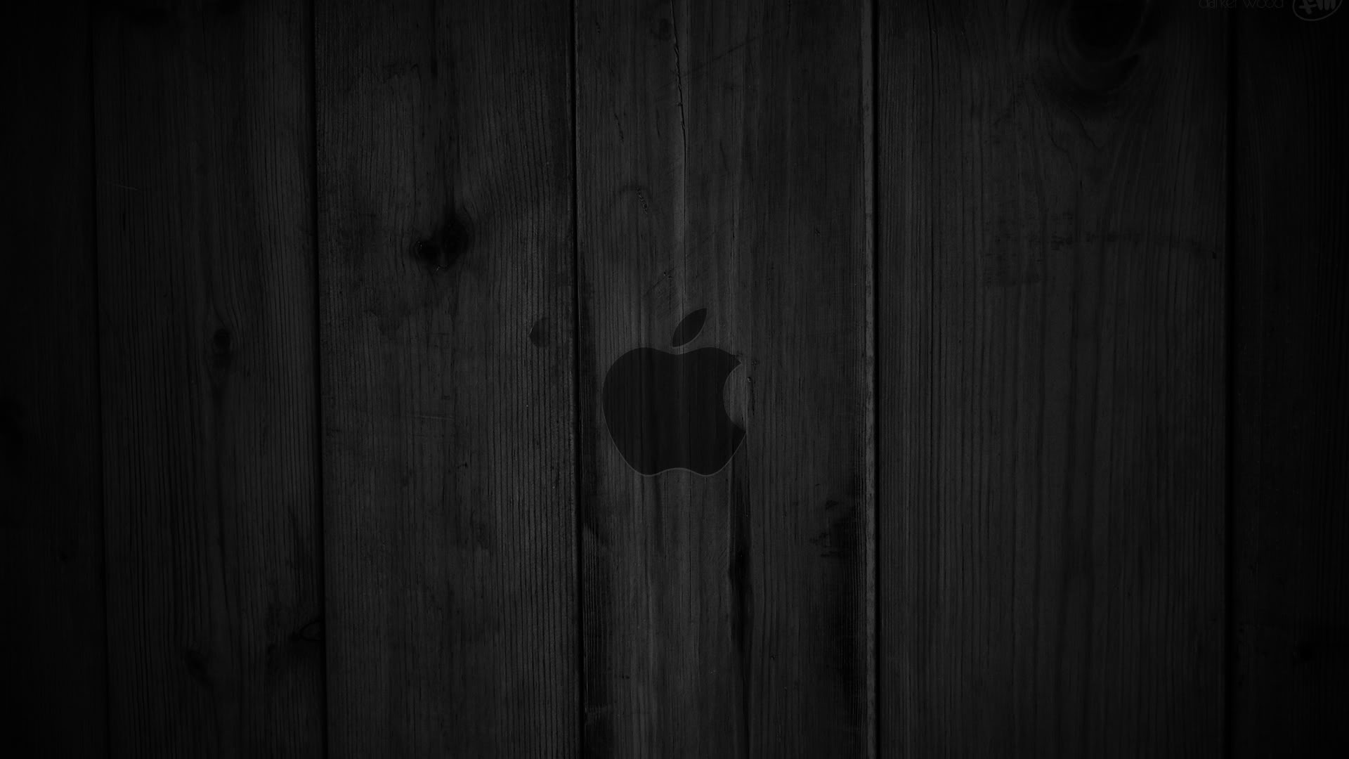 Description: A black and white photo of an apple logo on a wooden wall with a black background and a white apple logo.