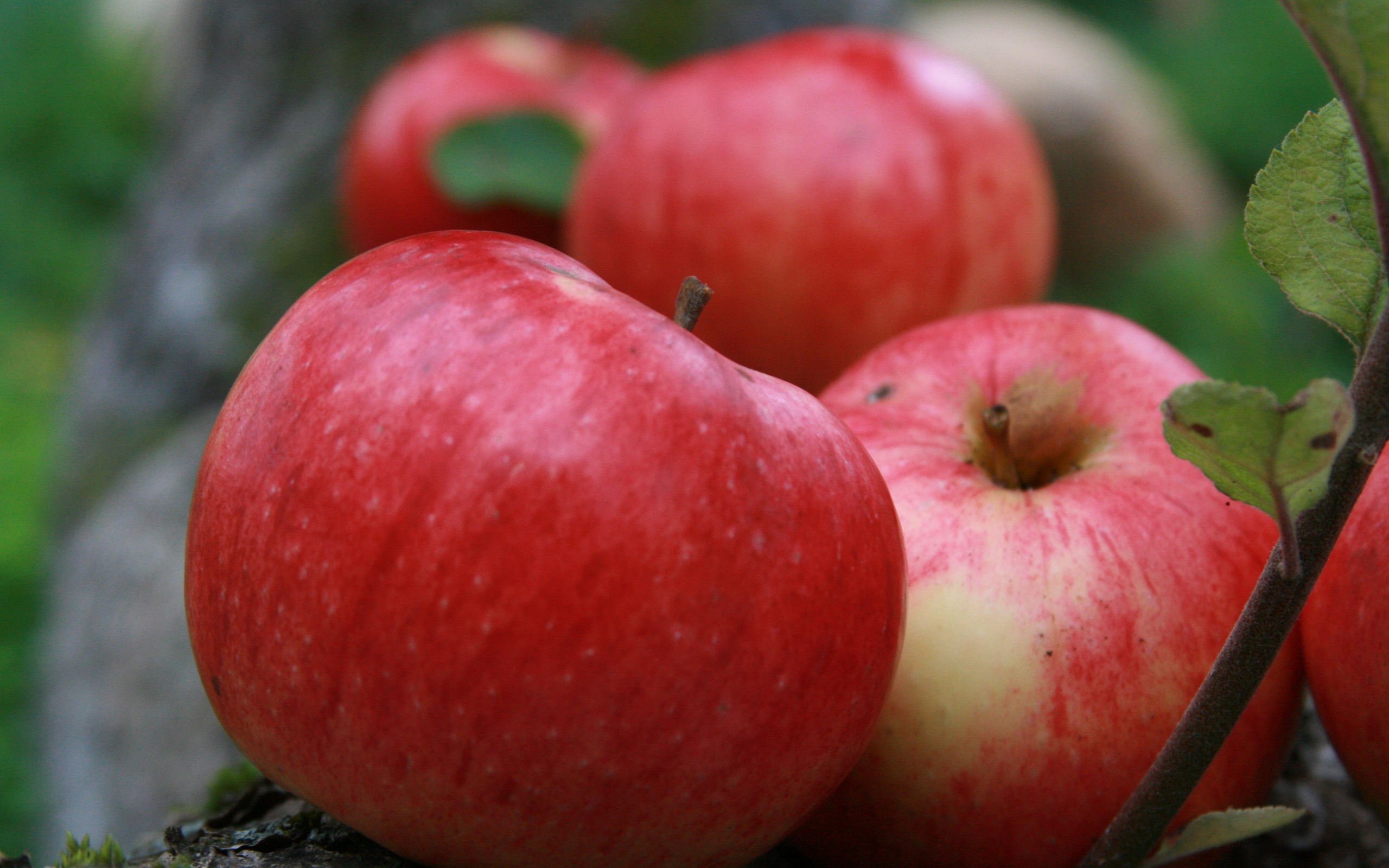 Description: A close up of three apples on a tree branch with leaves and a rock in the background with a blurry background.