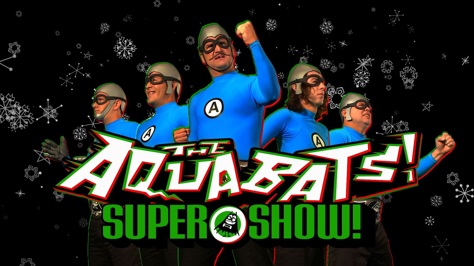 Description: A group of men in blue suits and masks with the words the aquabats super show on them.
