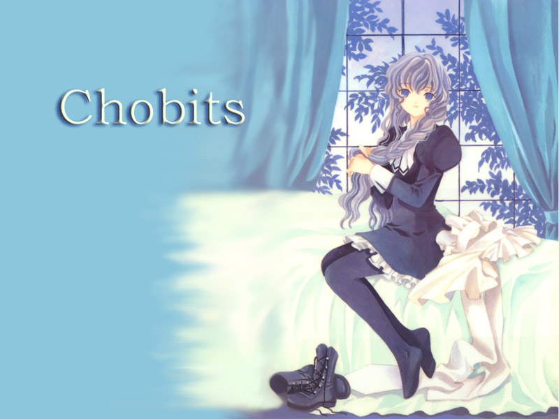 Description: A woman sitting on a bed with a blue background and a blue curtain behind her and a blue and white background with the words chobits written below her.