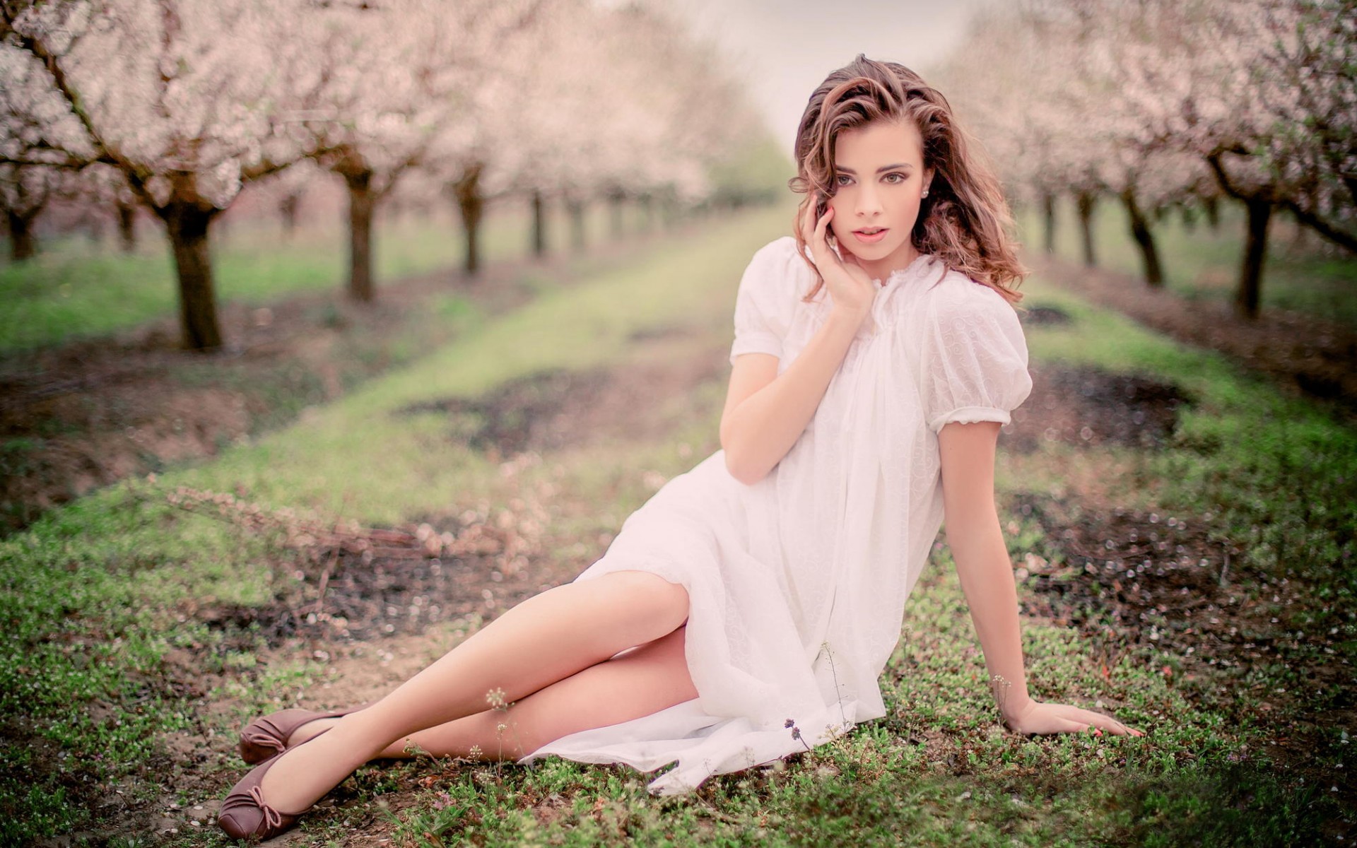 Description: A woman sitting on the ground in a field of trees with her legs crossed and her hand on her head.