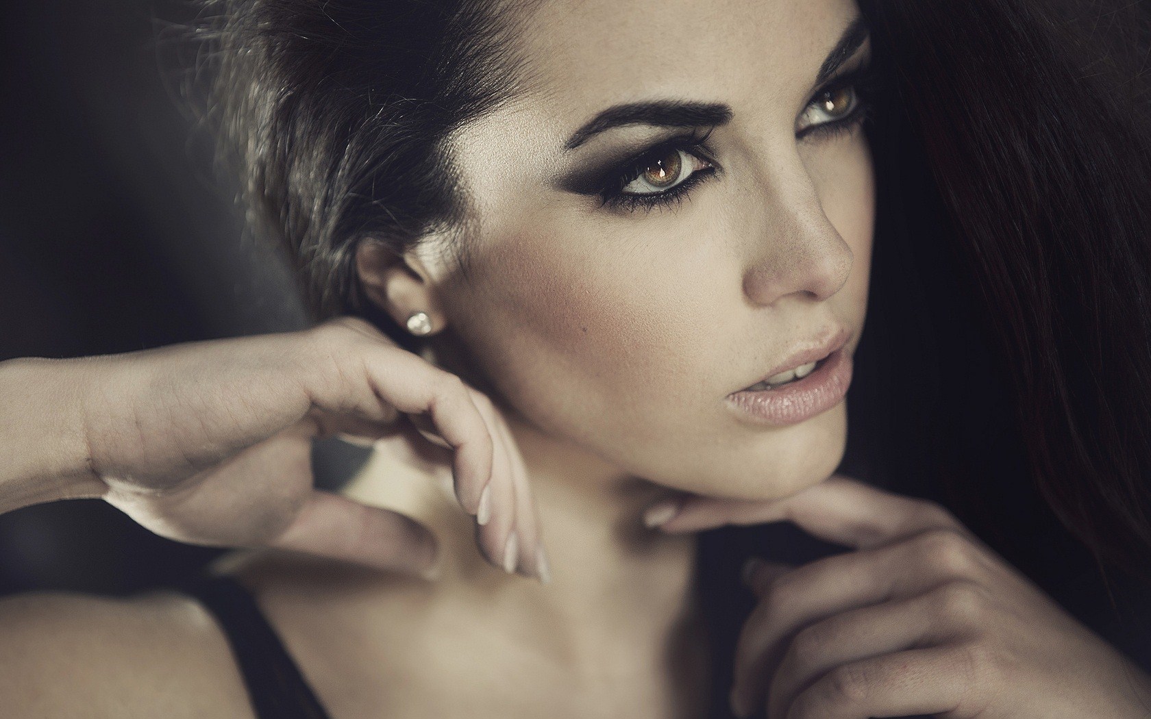 Description: A woman with long hair and a black dress is posing for a picture with her hands on her neck.