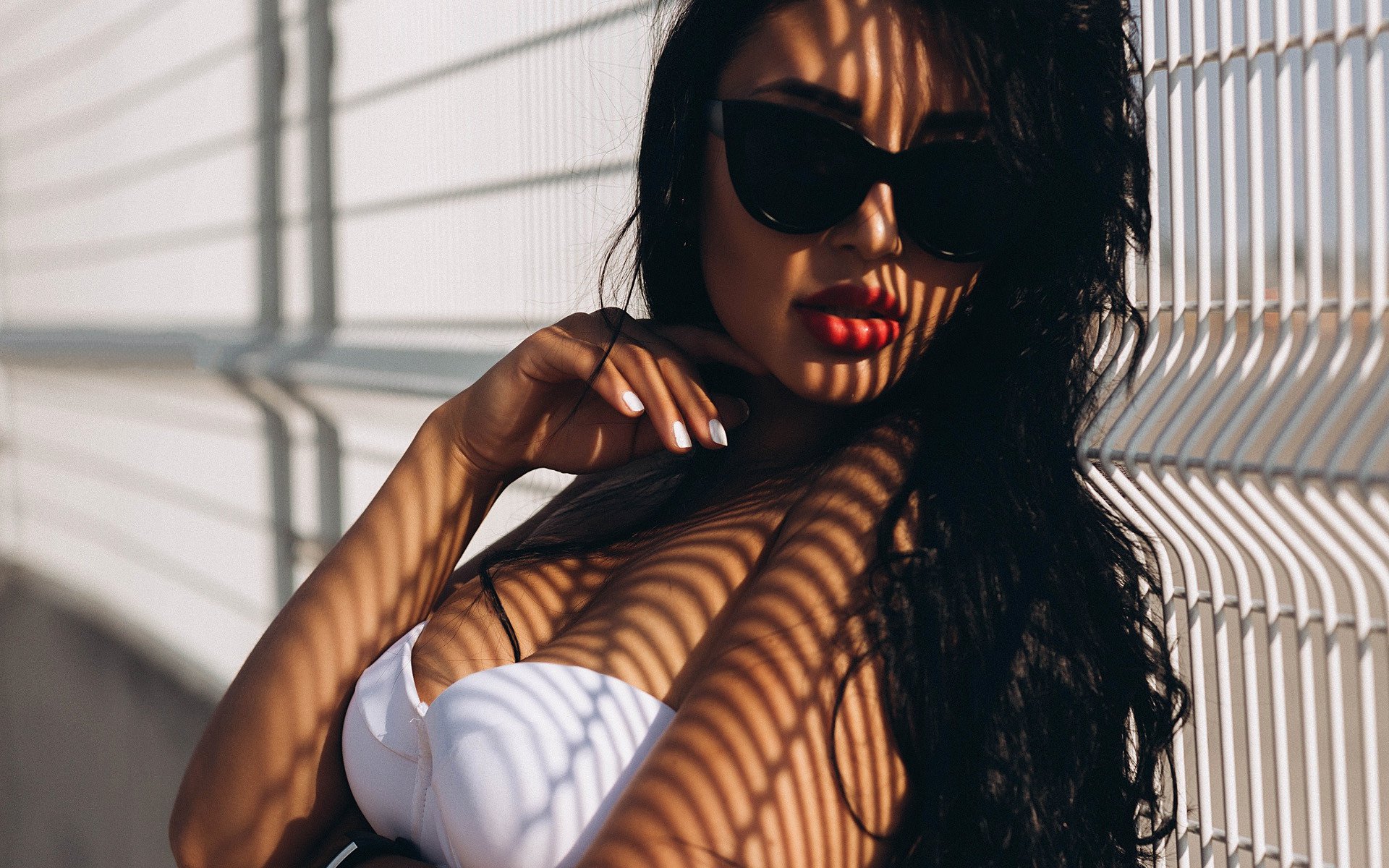 Description: A woman in a white bikini top and sunglasses posing for a picture with her arms on her chest and her hand on her hip.