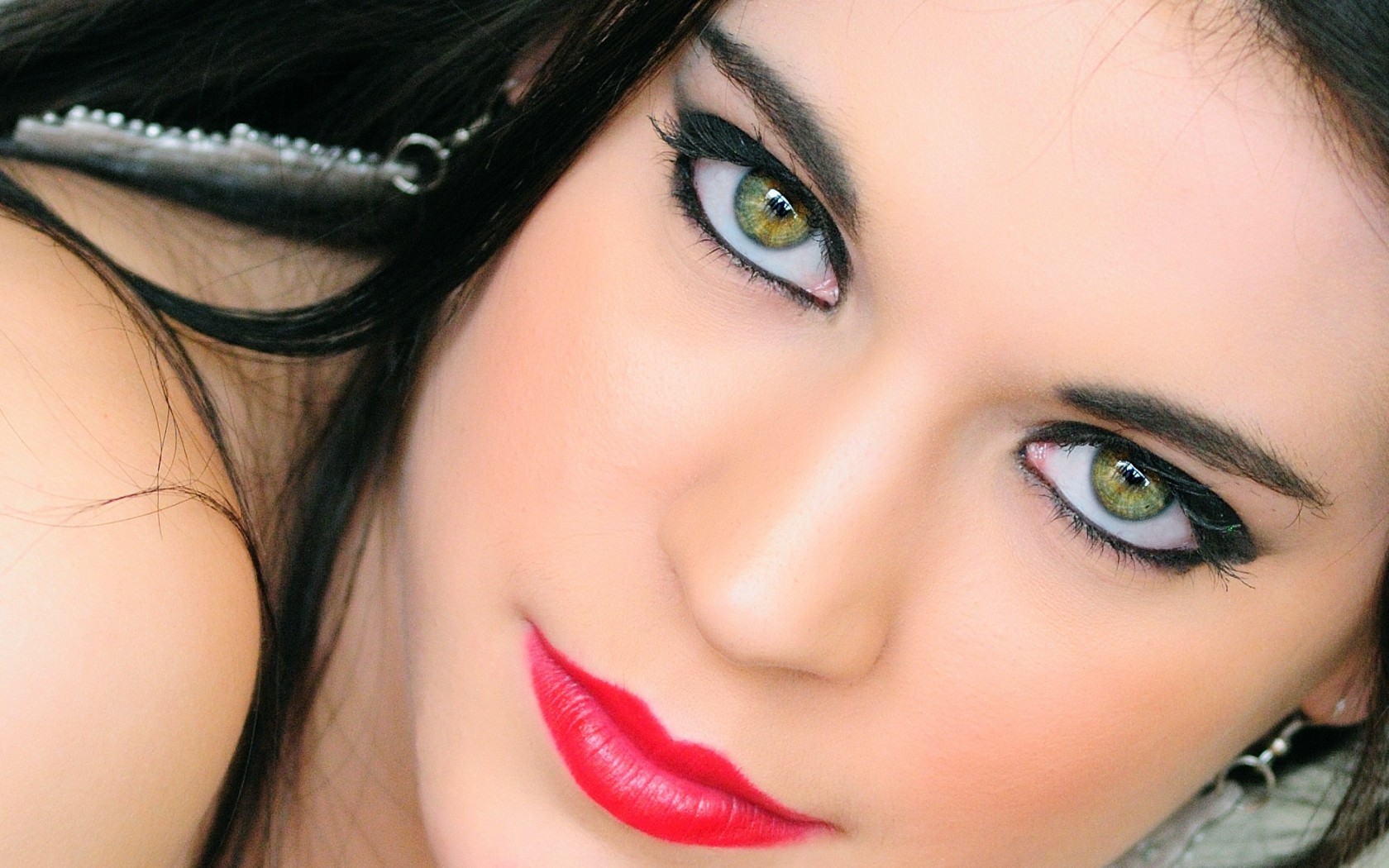 Description: A woman with long black hair and red lipstick on her face and a brush in her hand and a red lipstick on her cheek.
