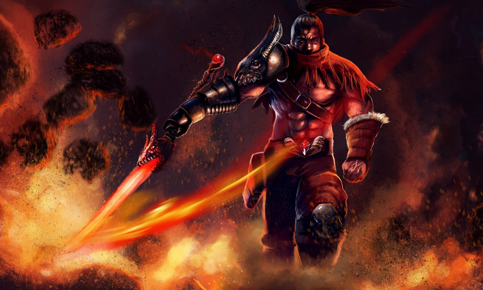 Description: A man in armor holding a sword in a fire filled sky with flames behind him and a demon on his back.