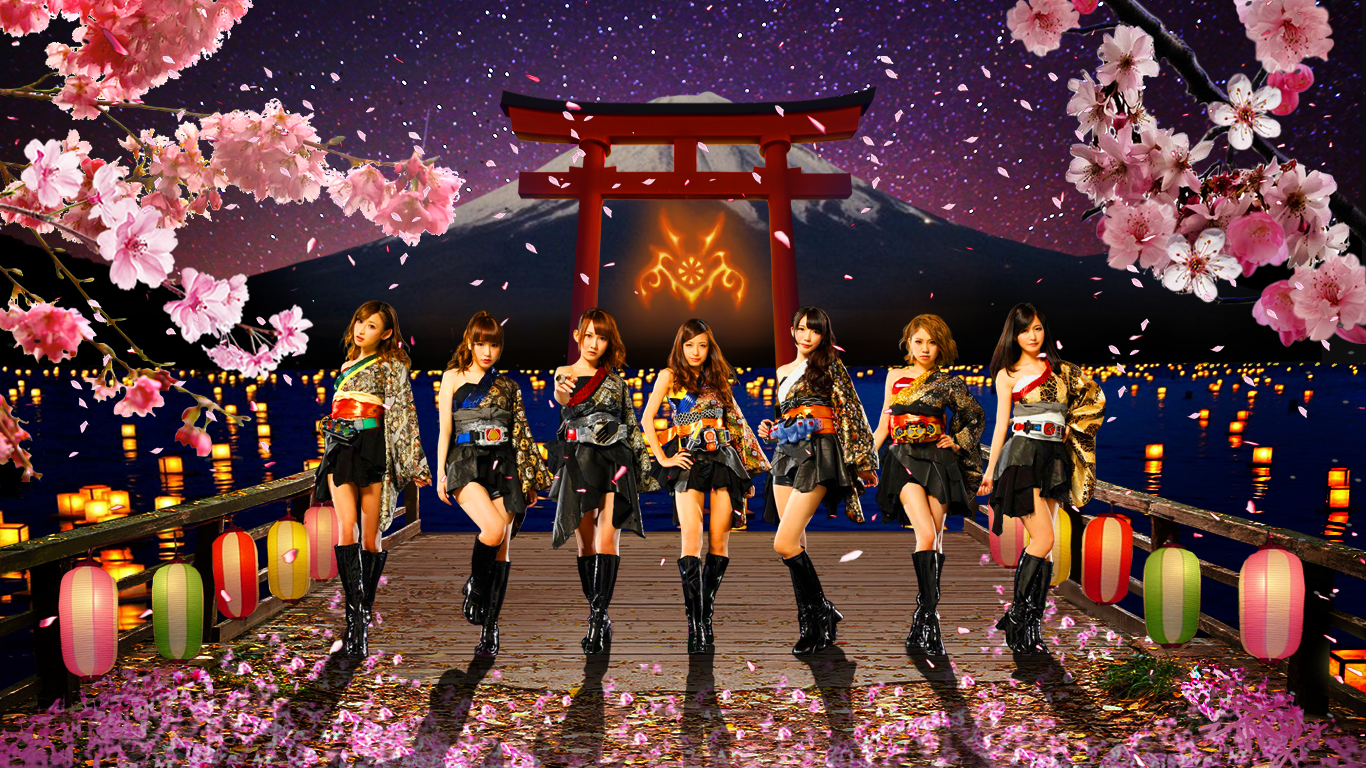 Description: A group of asian girls standing on a pier under a cherry blossom tree with a mountain in the background.