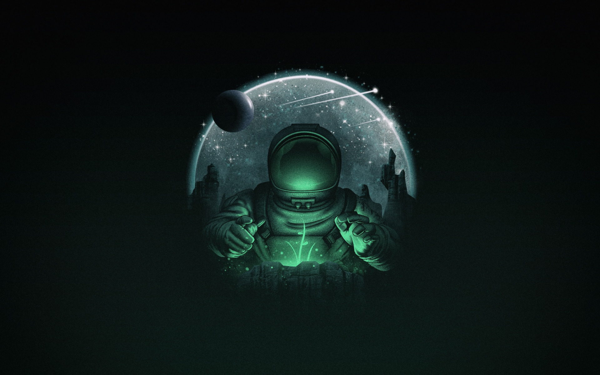 Description: A man in a space suit holding a glowing green light in his hands and a planet in the background.