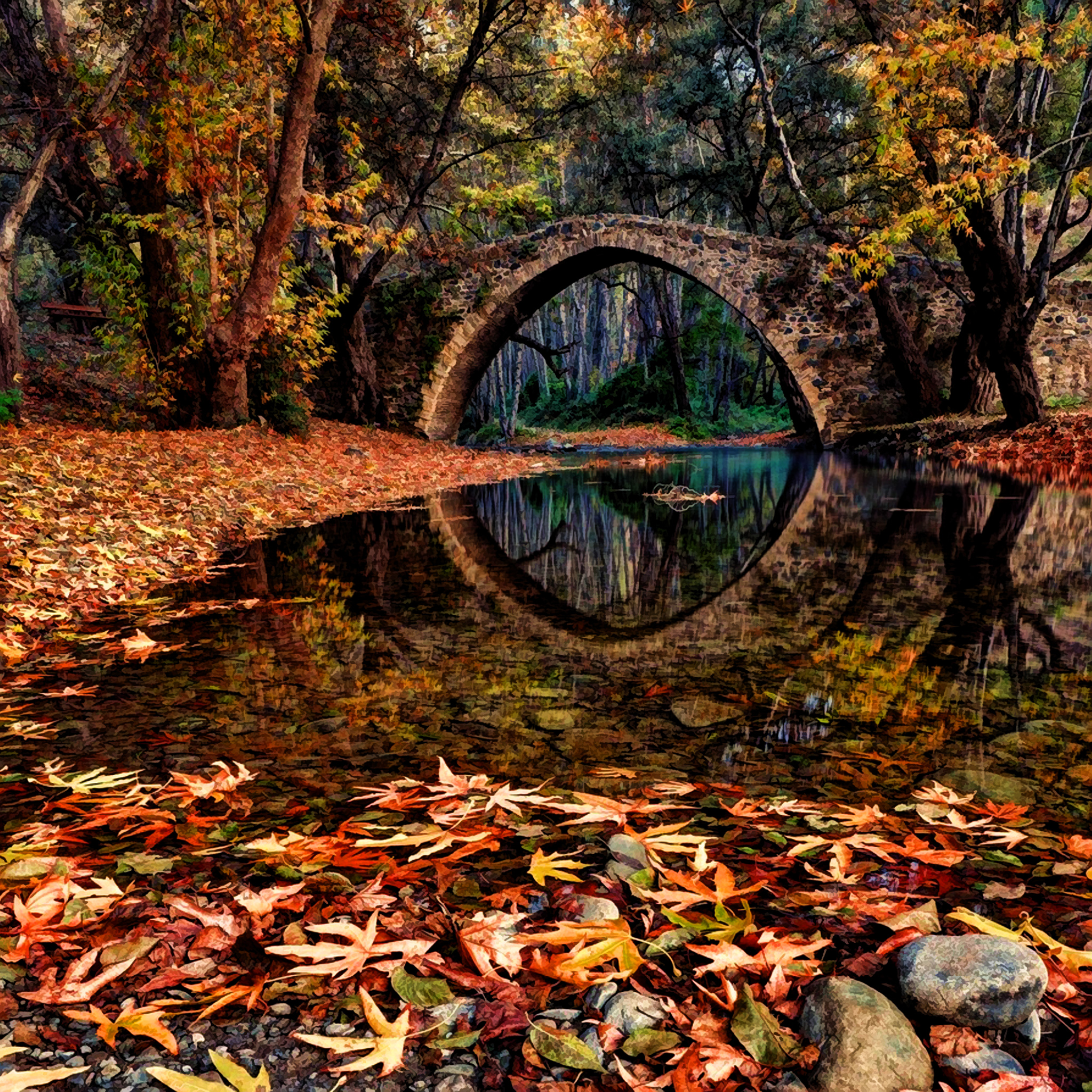 Description: A bridge over a river surrounded by leaves and trees in autumn time with a reflection of the bridge in the water.