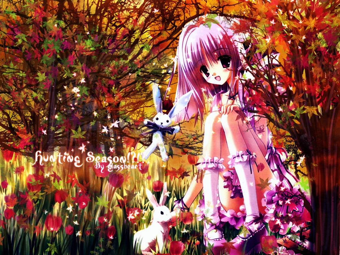 Description: A girl with a bunny in a field of flowers and trees with a rabbit in the background with a caption that reads future seasons.