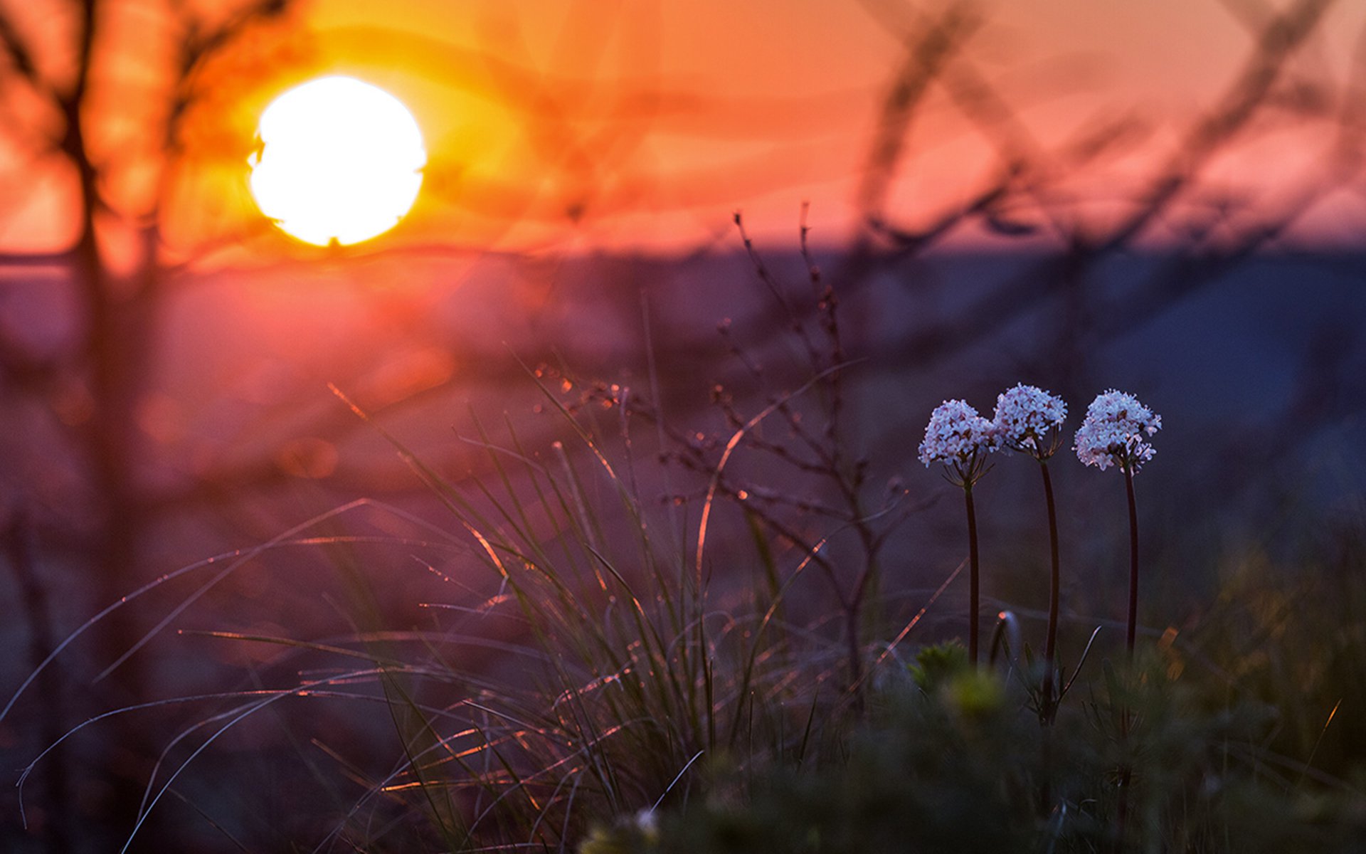 Description: A field with some flowers in the foreground and a sunset in the background with a few trees in the foreground.