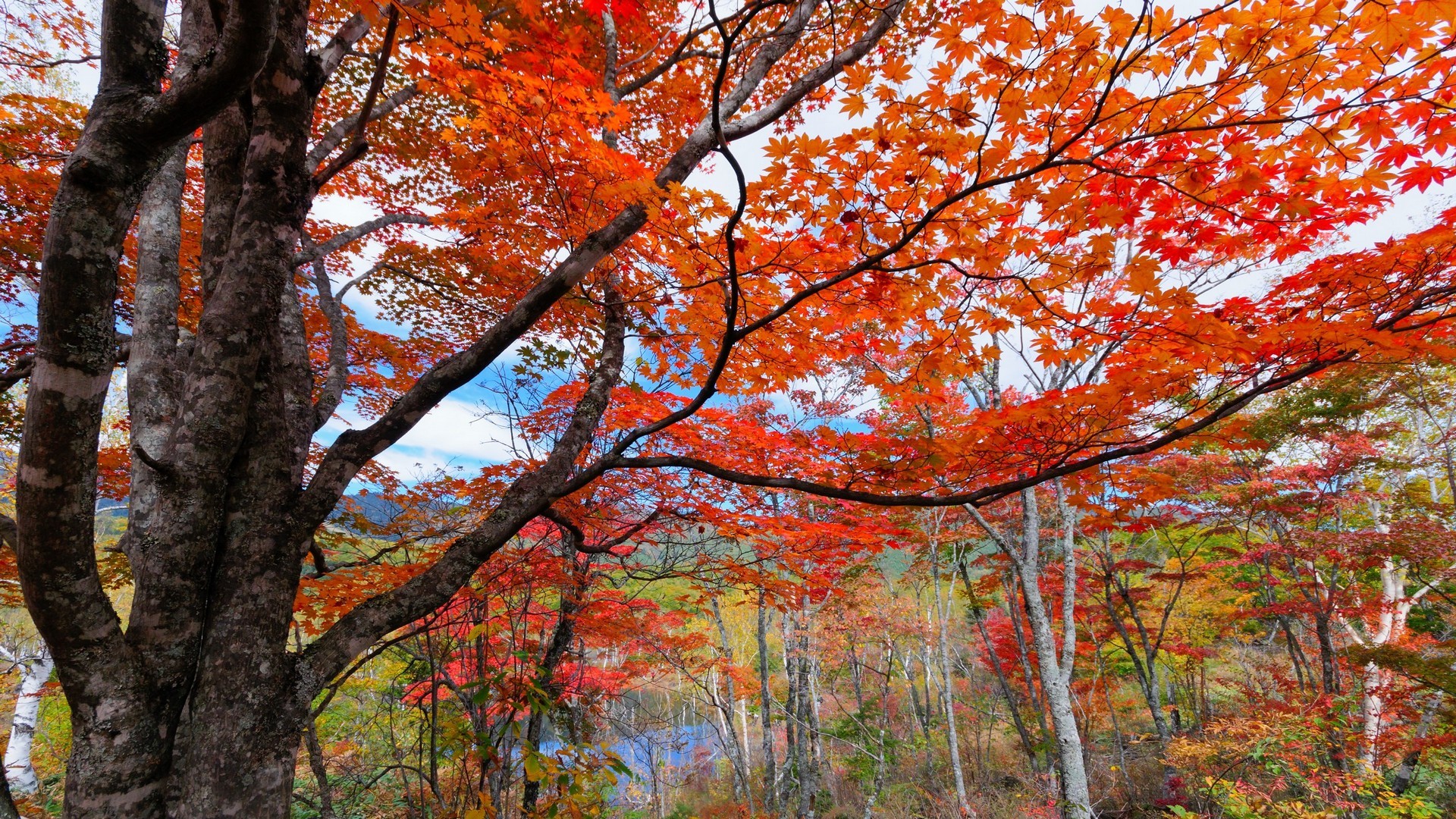 Description: A forest filled with lots of trees covered in fall leaves and red leaves on the trees and the ground.