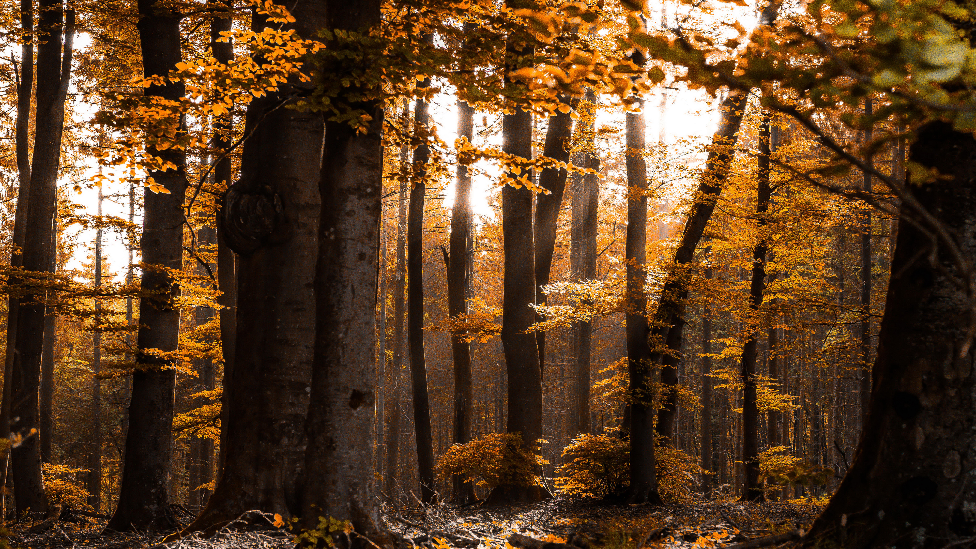 Description: A forest filled with lots of tall trees covered in yellow leaves and foliages with the sun shining through the trees.