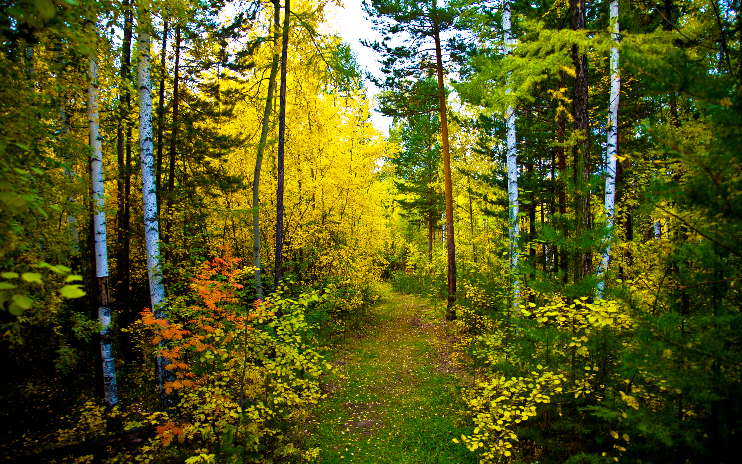 Description: A path in the woods with trees and yellow flowers on the side of it and a few bushes on the side.