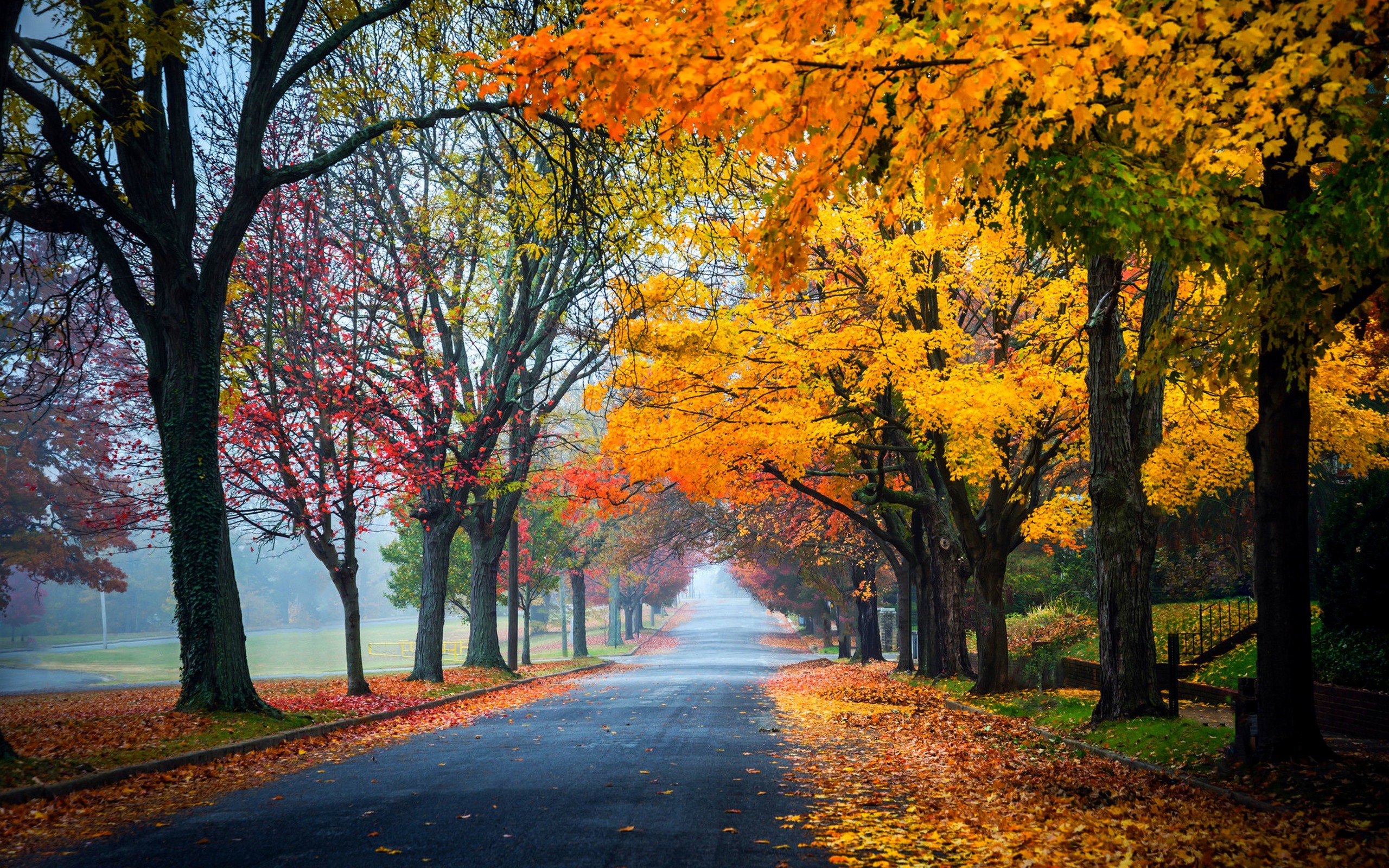 Description: A road lined with trees with yellow and red leaves on it and a bench on the side of the road.
