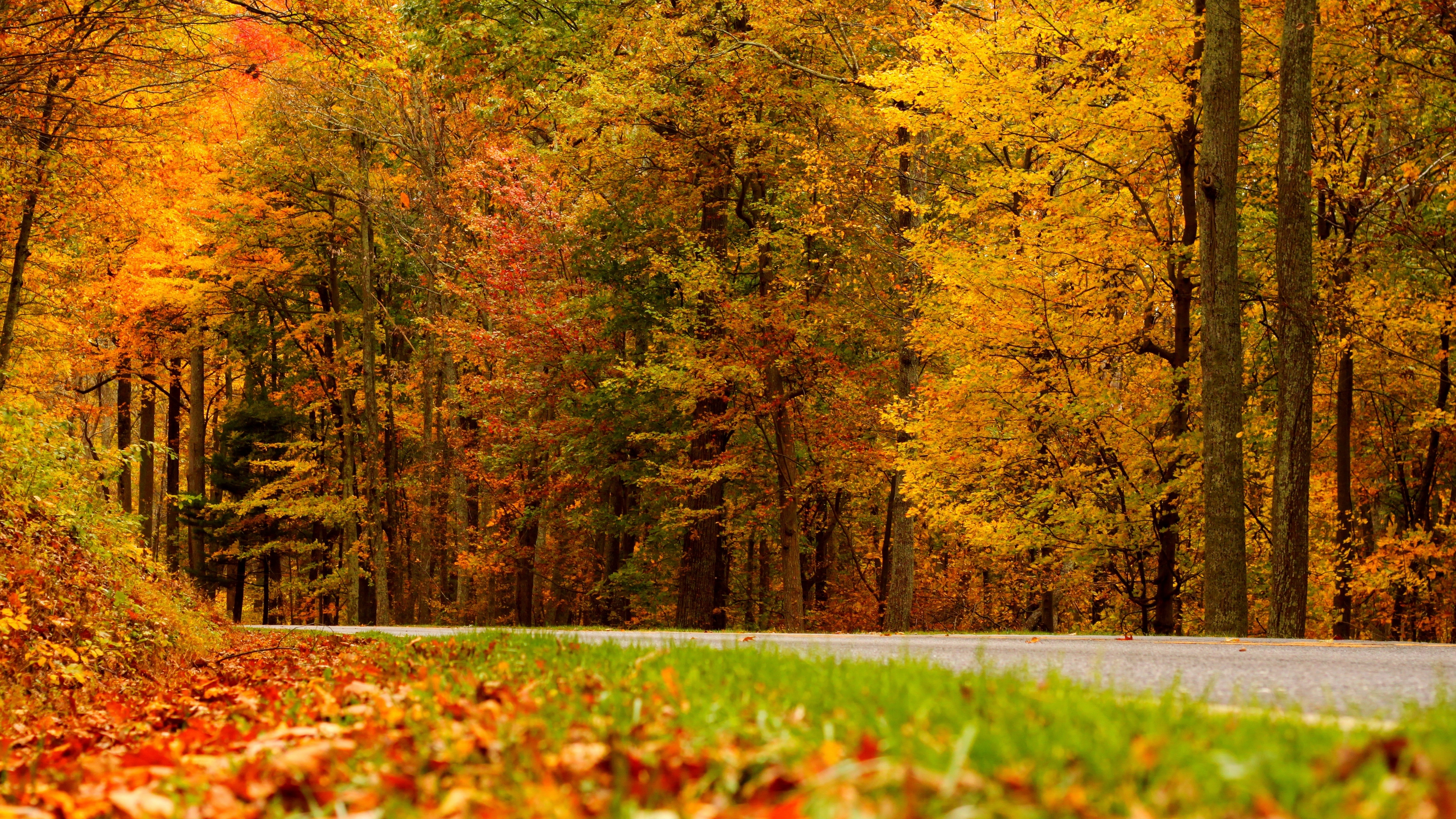 Description: A road surrounded by trees with fall leaves on the ground and grass in the foreground and a few trees with orange and yellow leaves on the ground.