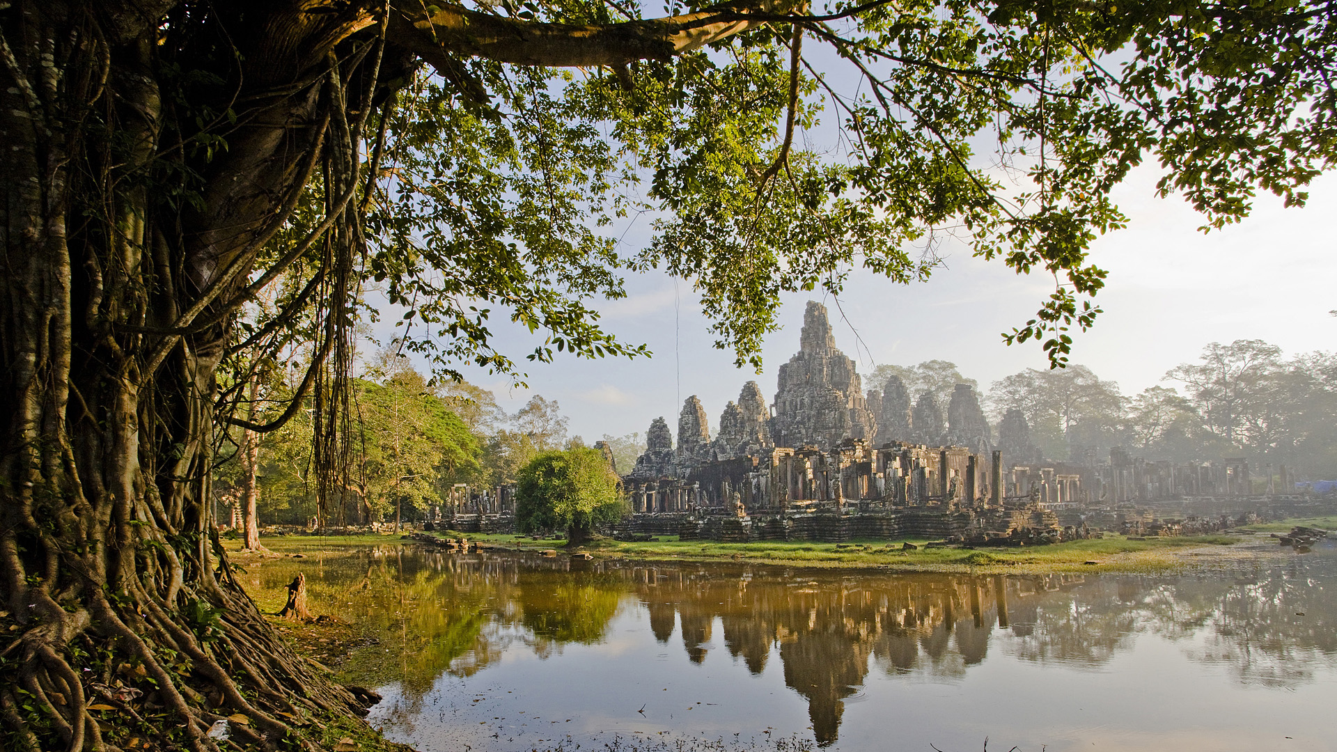Description: A large body of water surrounded by trees and a building with a spire on top of it and a few people walking around.