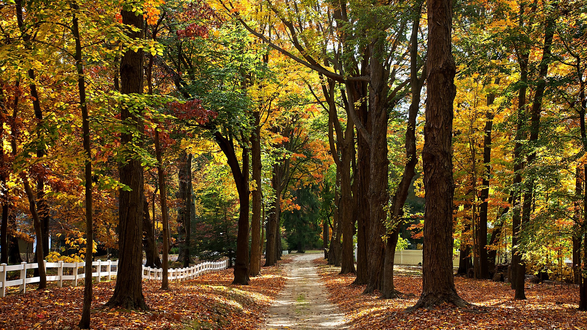 Description: A path in a park with trees and leaves on the ground and a white fence in the background with a white picket fence.