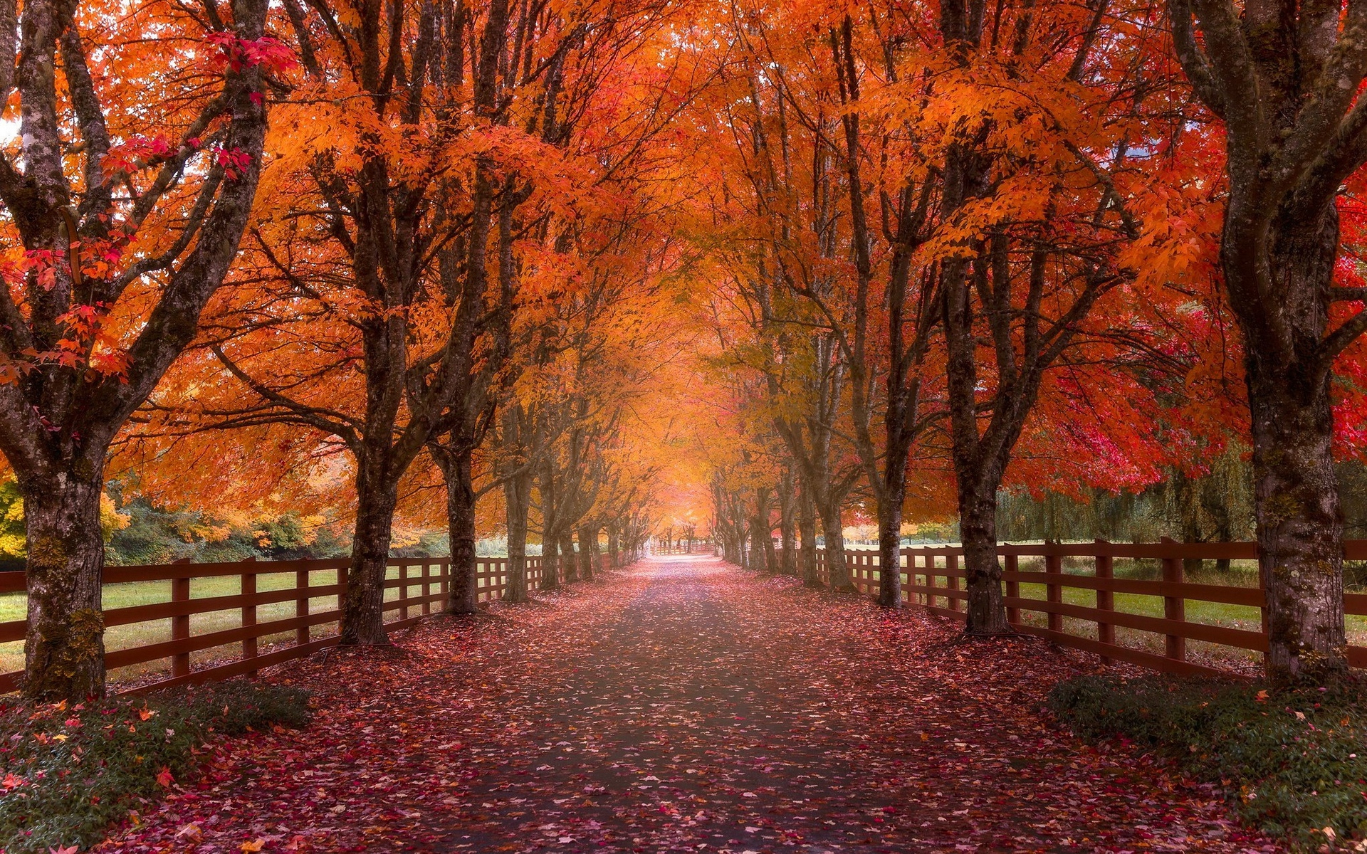 Description: A pathway lined with trees with orange leaves on the ground and a fence in the middle of the path.