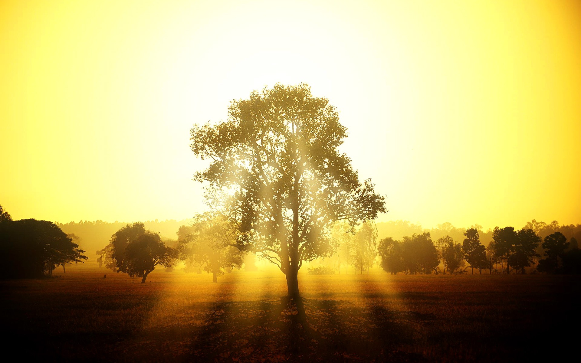 Description: A tree in a field with the sun shining through the trees and the grass in the foreground is a yellow sky.