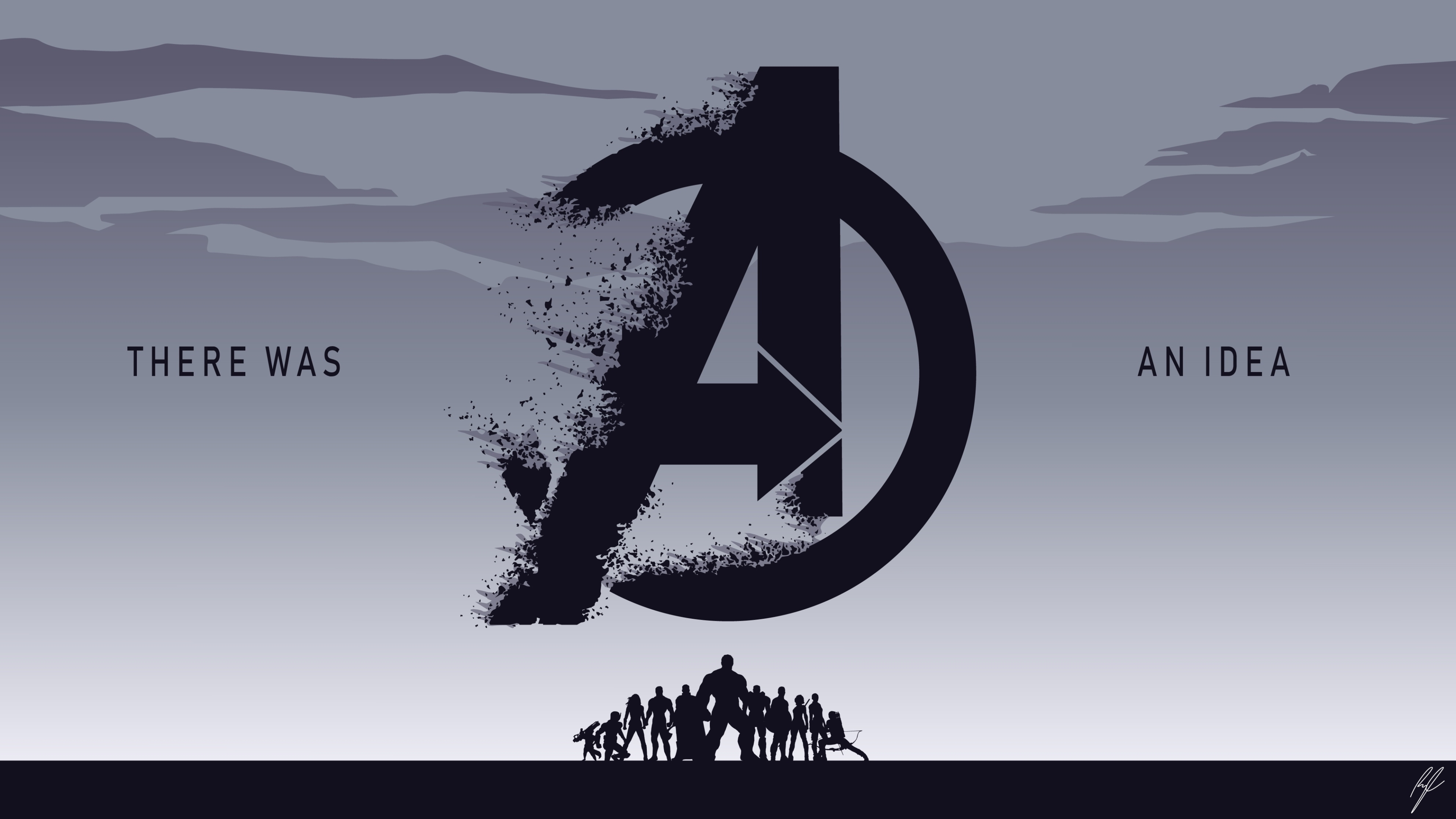 Description: A poster with the avengers logo and the words there was an idea on it and people standing in front of it.