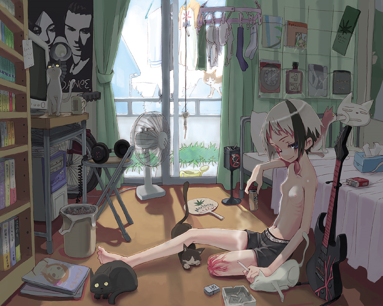 Description: A woman sitting on the floor with a cat in her lap and a cat laying on the floor next to her.