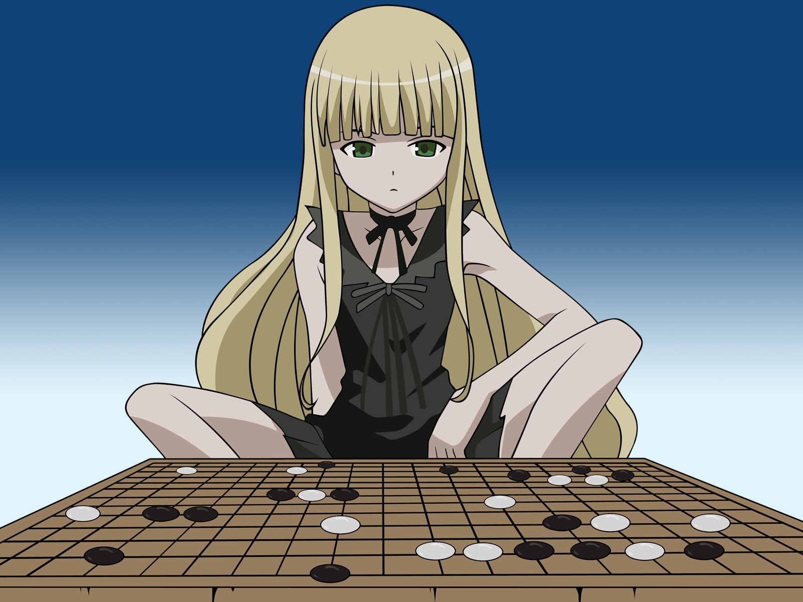 Description: A woman sitting on a floor with a board game in front of her and a blue background behind her.