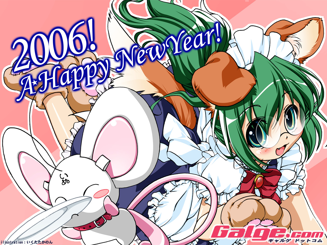 Description: A cartoon character with a rabbit on her lap and a happy new year message in the background with a cartoon character.