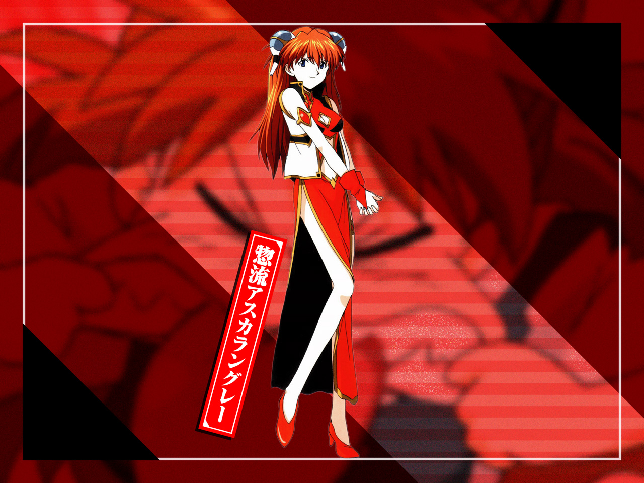 Description: A anime character with a red and black outfit and a red and white banner with a red and black background.