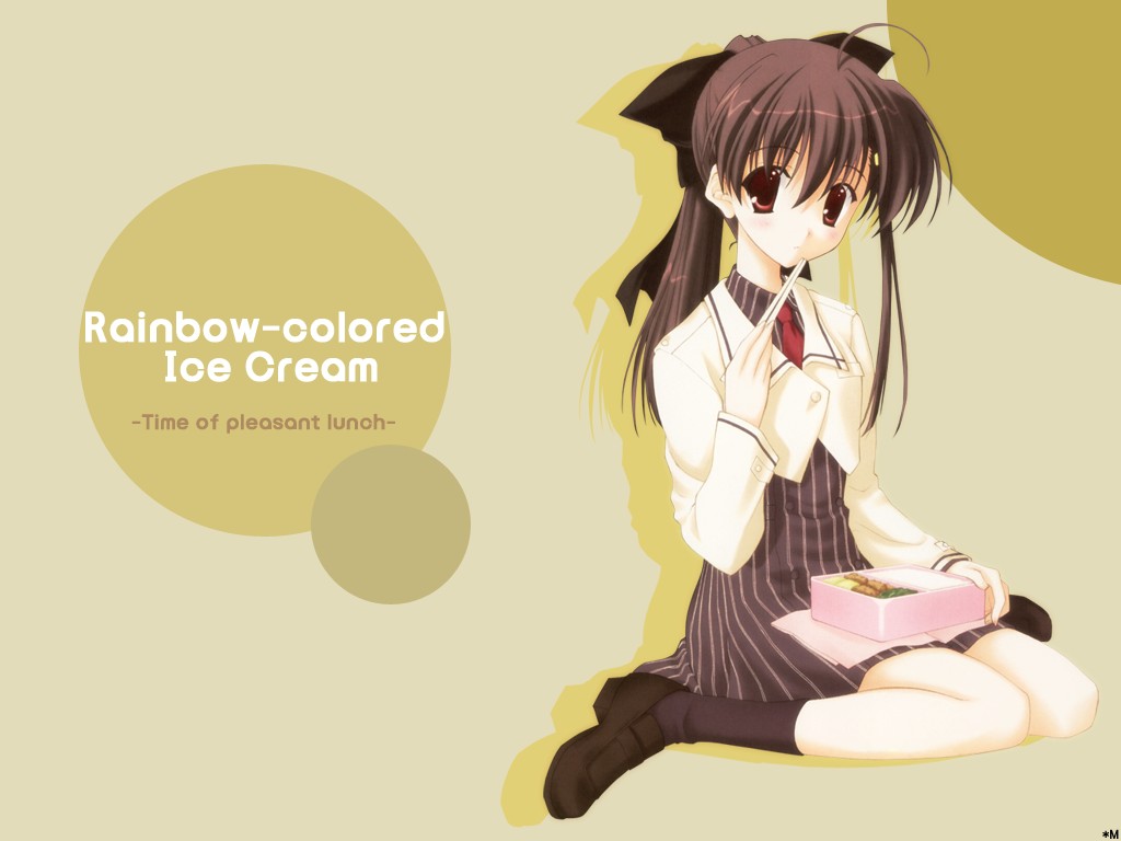 Description: A girl sitting on the ground with a box of ice cream in her hand and a caption below.