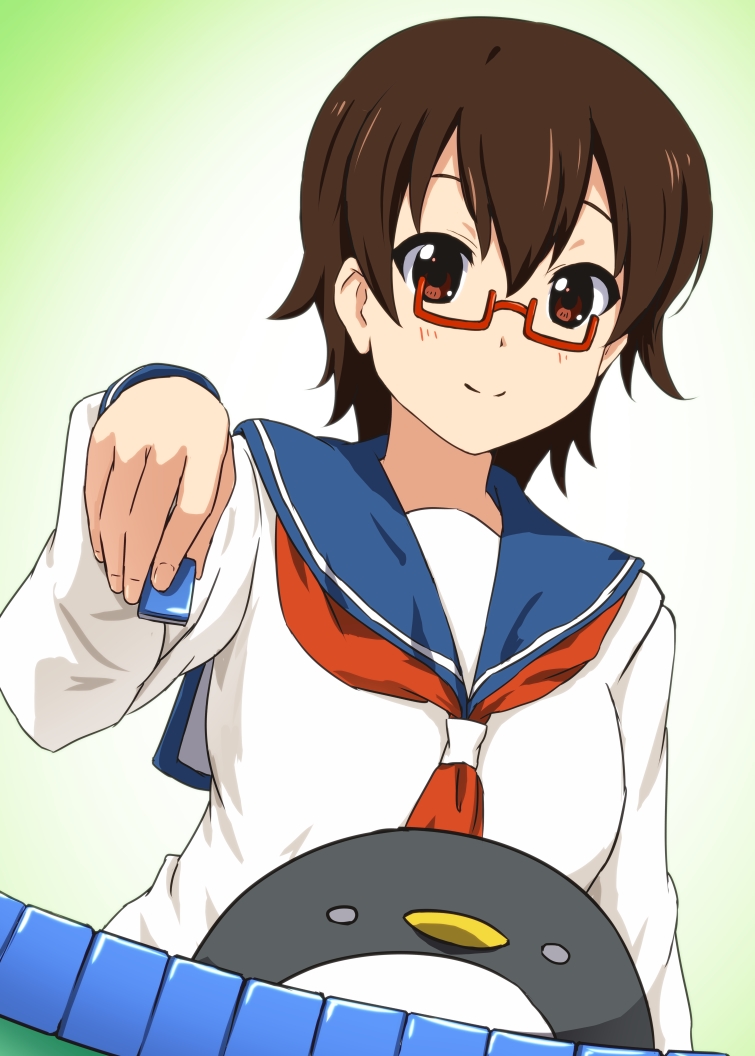 Description: A woman in a sailor outfit holding a steering wheel and pointing at the camera with a green background behind her.