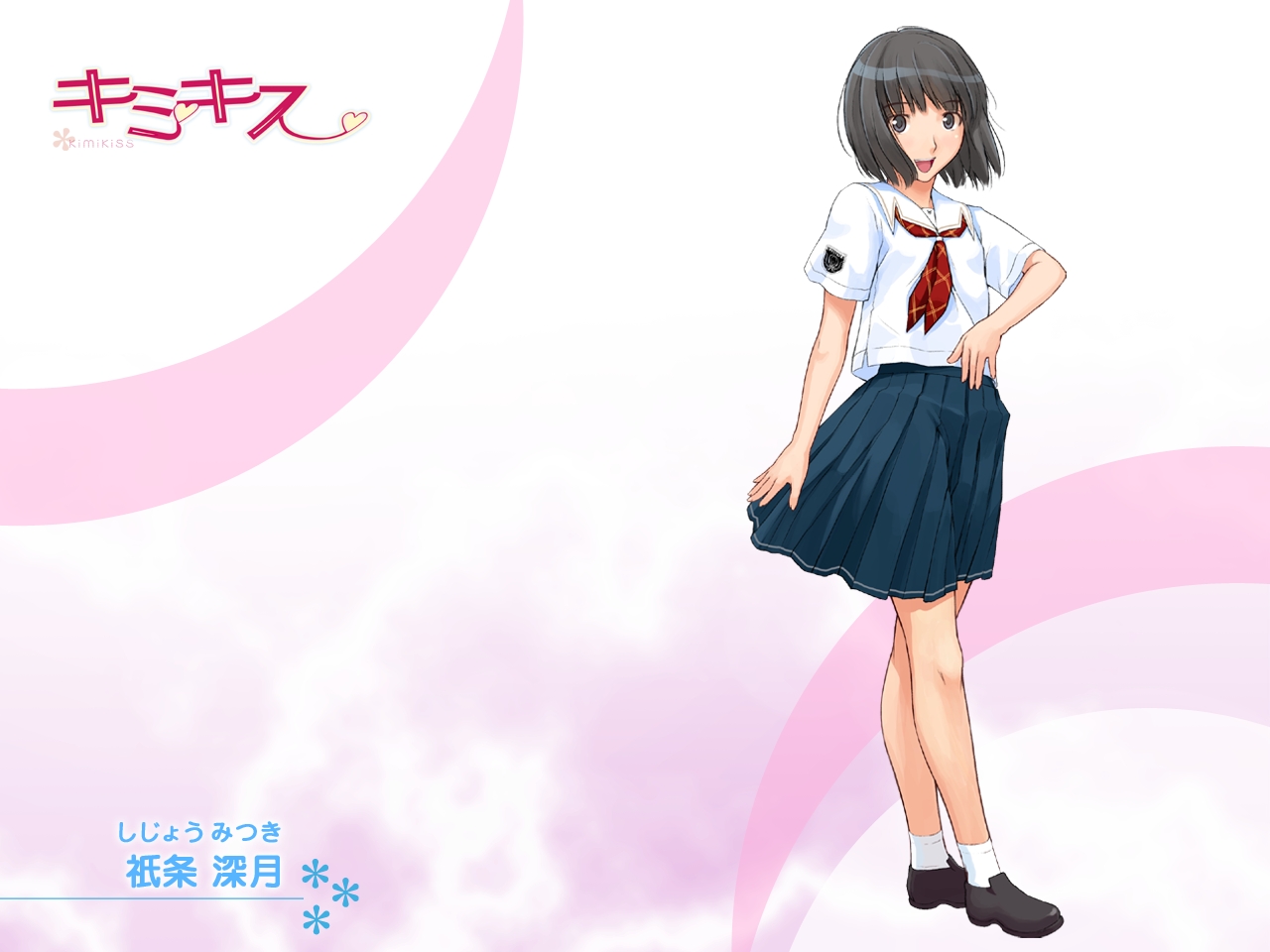 Description: A girl in a school uniform is standing in front of a pink background with a japanese writing on it.