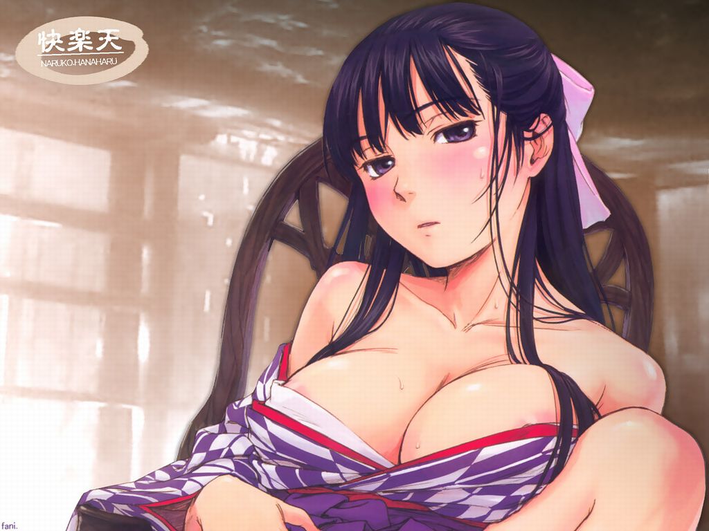 Description: A woman with big breast sitting in a chair with her hands on her hips and looking at the camera.