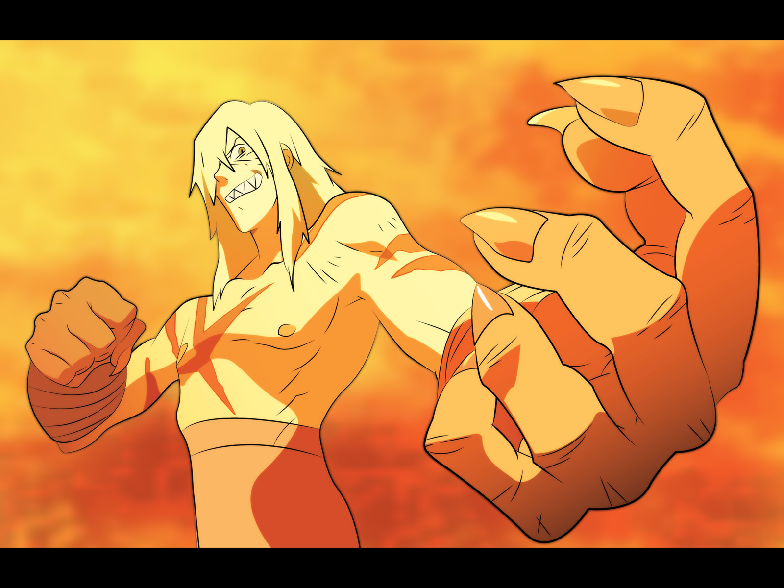 Description: A cartoon character with a fist in his hand and a yellow background behind him with a red and yellow background.